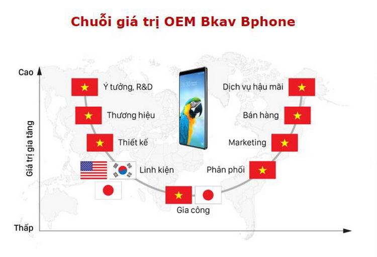Vậy thì anh cũng có thể thấy giống như Apple, Samsung hiện nay, họ cũng đang sử dụng linh kiện của tất các công ty trên thế giới. Ví dụ như tụ điện, điện trở thì nổi tiếng nhất là Nhật Bản. Có công ty Murata mà chúng tôi làm việc, họ có hàng trăm năm kinh nghiệm về những thứ đó và họ cung cấp cho cả thế giới, cung cấp cho Apple, cung cấp cho Samsung, cung cấp cho các công ty Trung Quốc và cung cấp cho Bkav. Vậy thì gia tăng trong trường hợp đó giống như câu chuyện làm phở. Quán phở mà chúng ta ưa thích hay họ bán rất chạy phụ thuộc vào bí quyết hoặc nhà nghề của chủ quán đó. Họ tích lũy nhiều năm hay gia truyền bí kíp để lại. Thế còn lại thì họ cũng mua phở, mua hành và các nguyên liệu khác giống như chúng ta mua về dùng. Nhưng rõ ràng họ có thể bán còn chúng ta thì chưa chắc. Và nó gia tăng ở chỗ đấy.