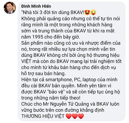 ...Mình rất đồng tình với fb Đinh Minh Hiến sản phẩm nào cũng có ưu, nhược điểm. Nhưng mọi người vẫn dùng Bphone hay các sản phẩm của Bkav không chỉ vì ủng hộ thương hiệu Việt mà còn vì các trải nghiệm của Bkav mang lại cho khách hàng.